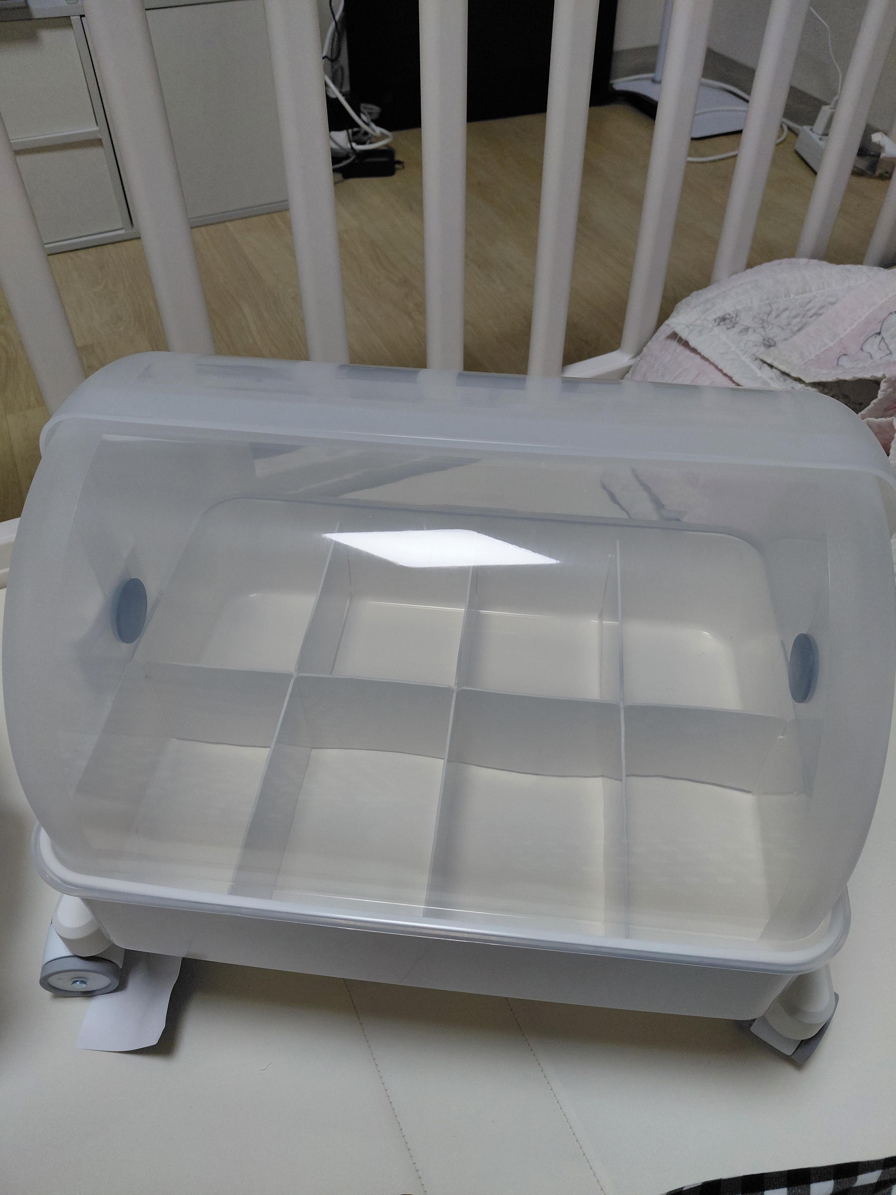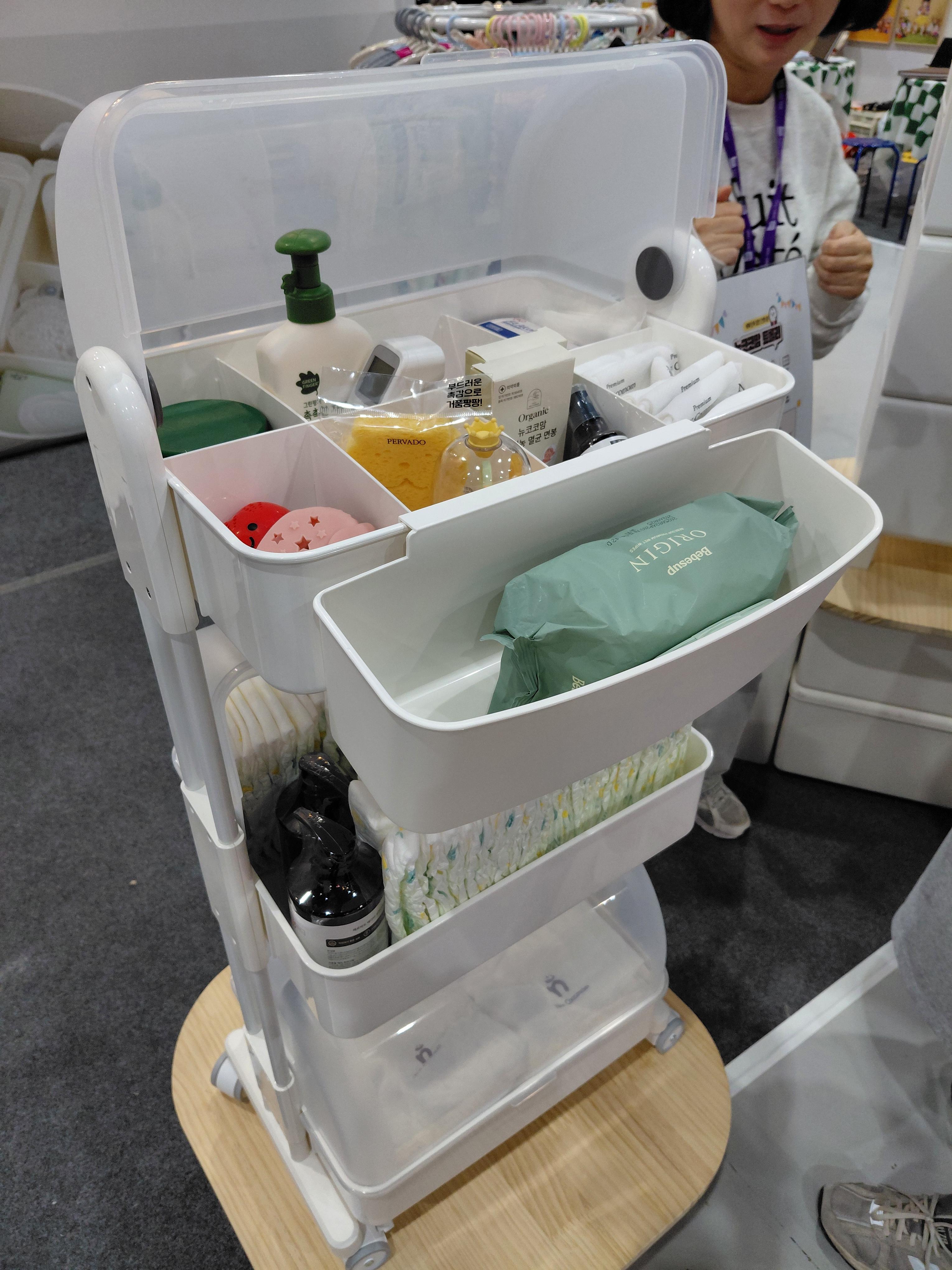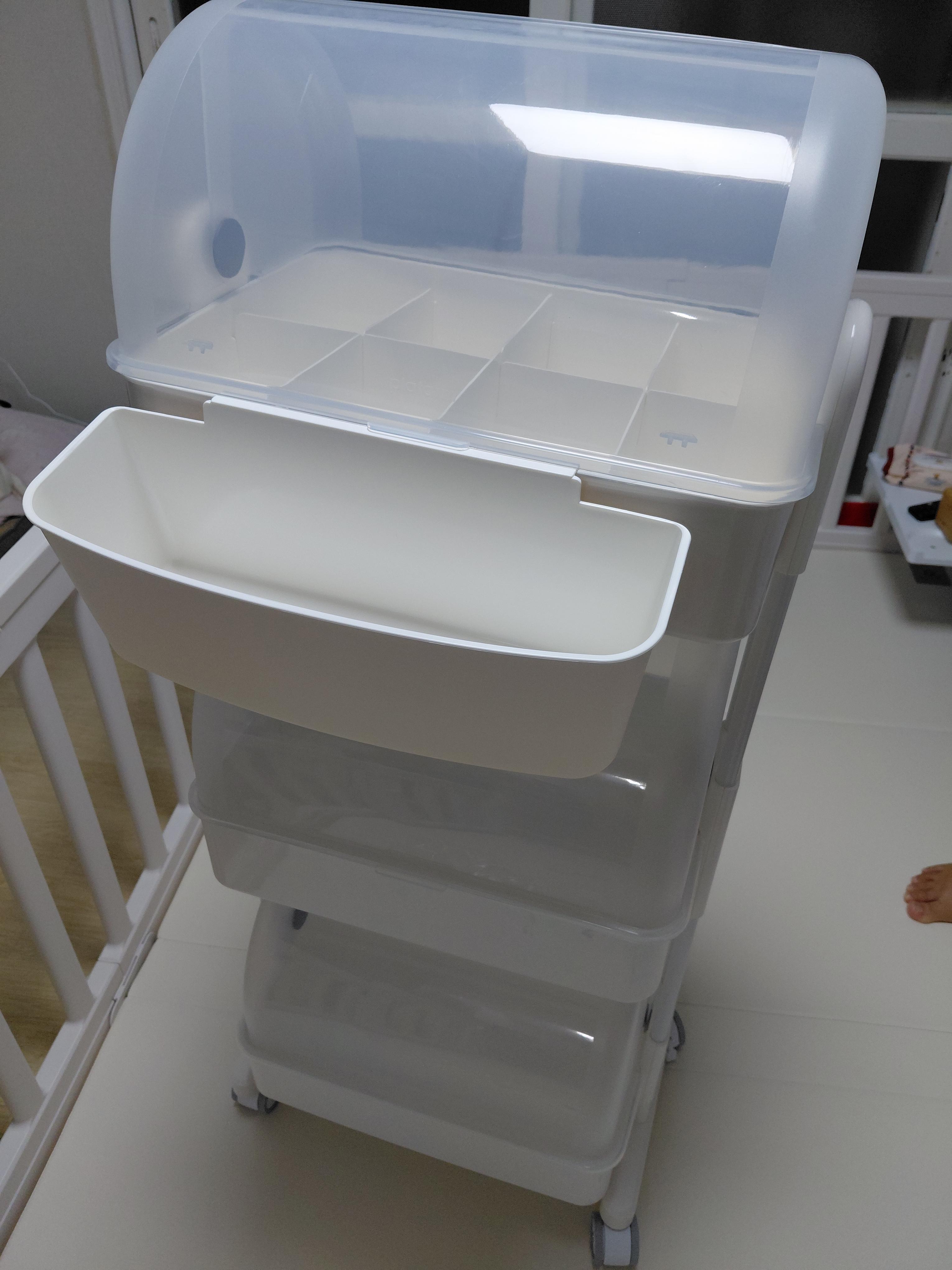 조립해서 놓으니 뿌듯하면서도 성취감이 ㅎㅎㅎ 그리고 트롤리가 부피도 크지않고 바퀴가 있어 이동도 편리합니다. 그래서 애기 침대 옆에 놓고 사용하면 편하고 좋아서 저는 굉장히 만족하는 제품입니다.