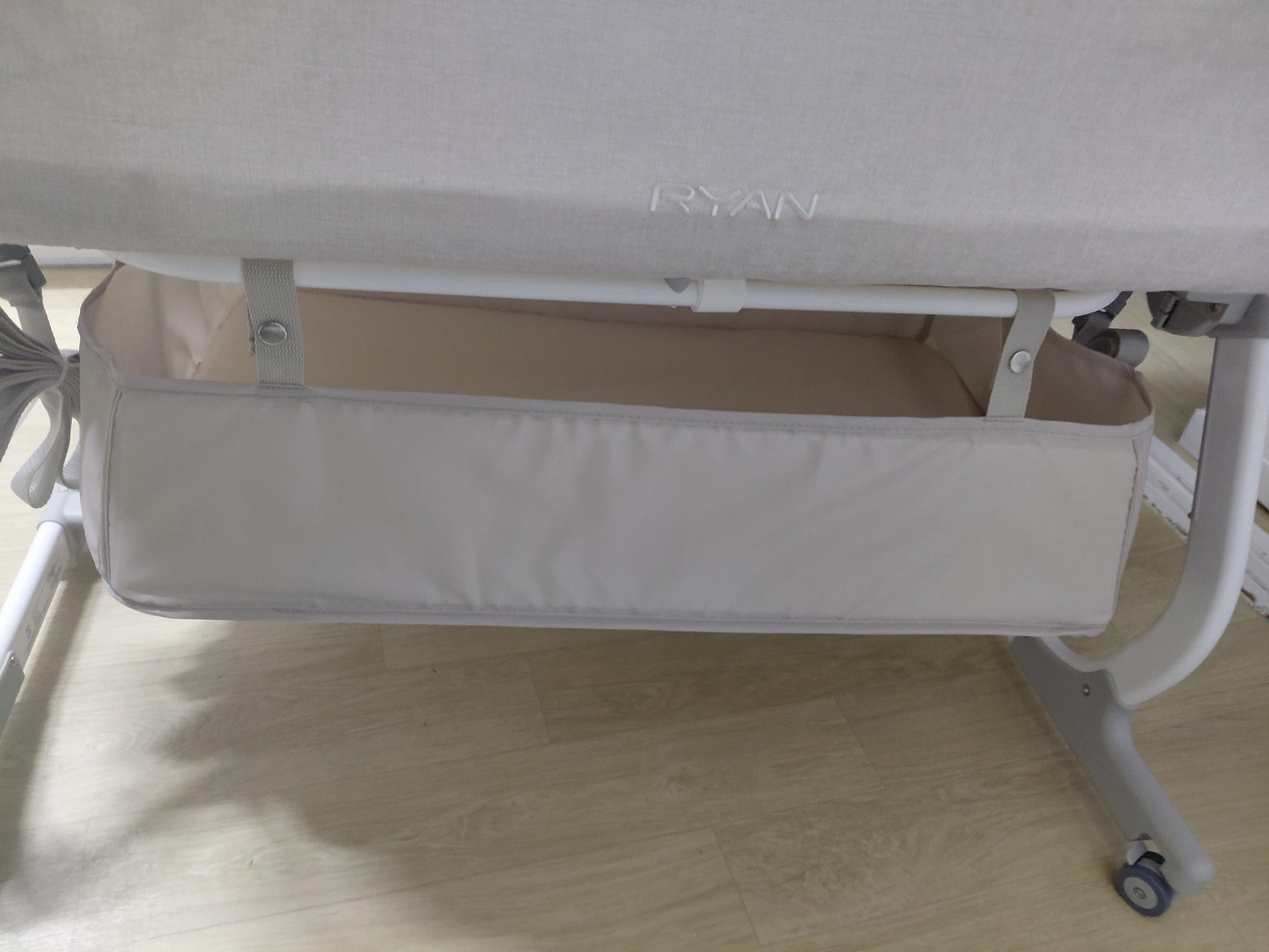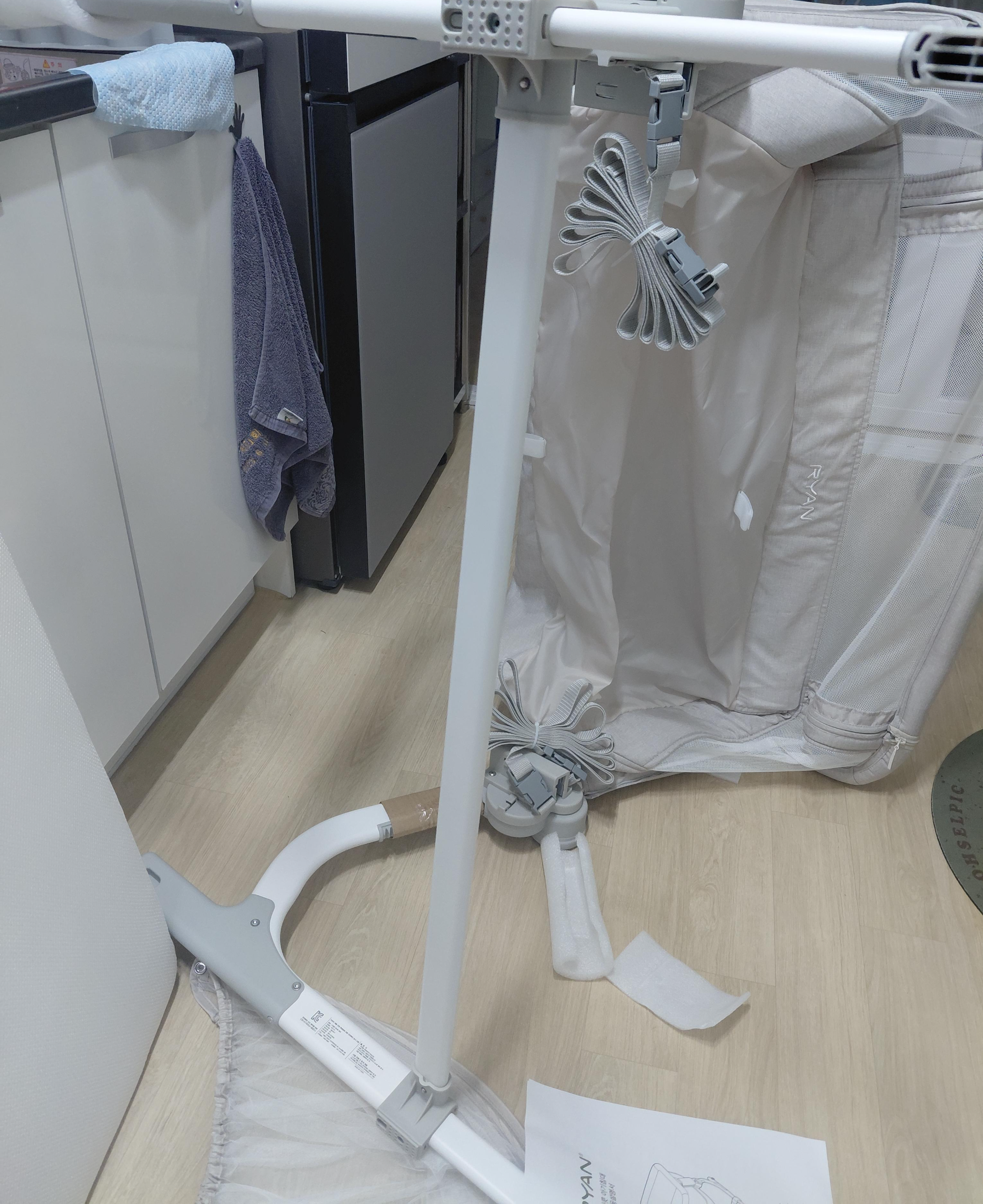 설치를 완료하셨다면 다음은 가방을 설치해주시면 되는데 가방은 펴서 침대 아래쪽에 보면 똑딱이 버튼 식으로 연결하는 구간이 있는데 연결하여 사용해주시면 되고, 저희는 기저귀나 손수건 등등 보관하여 바로바로 사용하고 있어서 설치하시는 것을 추천드리고, 모기장은 아직 사용할 때가 아니라 보관했다가 여름에 사용하시면 되겠습니다.