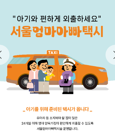 영아를 데리고 갑자기 나가야 하는 일이 생겨서 택시를 부르게 되면 카시트가 구비된 택시를 지원해주는 사업이 있습니다. 바로 "서울엄마아빠택시" 인데요!