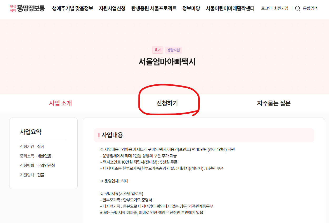 영아 1인당 연 10만원 이용할 수 있는 포인트를 지원해주는 택시비 지원사업 예산 소진전에 빠르게 신청하시기 바랍니다. 신청 3분도 안걸리니 지금 바로 신청하시는 것을 추천드립니다.