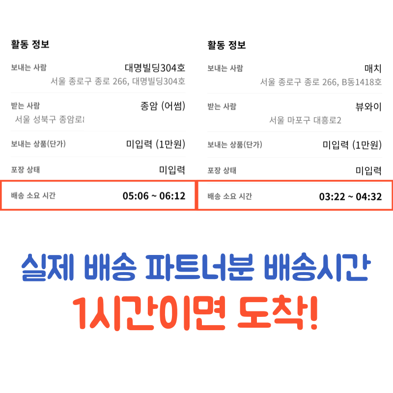 어딜을 자주 이용해주시는 분들의 만족도가 가장 높은 건 바로 빠른 배송시간입니다. 동대문종합시장 특성상 오토바이 퀵은 바로 출발하는 것보다 방향이 같은 물건들을 모아서 한번에 출발하는 경우가 많습니다. 하지만 지하철택배 어딜은 한건이라도 물건을 받는 즉시 접수 후에 바로 출발합니다. 그렇기 때문에 배송시간이 굉장히 빠를 수 밖에 없는데요! 실제로 어딜의 평균 배송 시간은 1시간 이내입니다. 물론 배송량이 많아서 같은 방향으로 묶음 배송을 갈 경우 마지막 배송지는 시간이 지연될 수 있지만 바로 출발하면 1시간이면 배송 완료하는 빠른 배송시간을 자랑합니다.