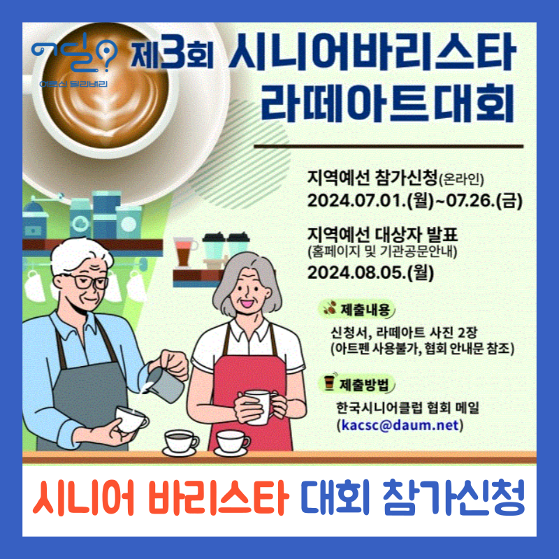 한국시니어클럽협회가 스타벅스와 함께 시니어 바리스타 라떼아트대회를 개최합니다. 대회에 참여하여 실력을 보여주실 시니어 분들을 위해 신청서 다운방법과 함께 참여 방법을 말씀드리려고 합니다. 참가신청은 24년 7월 26일(금)까지로 마감 전에 빠르게 신청하셔서 그동안 배운 실력을 펼치시길 바랍니다. 시니어분들의 새로운 도전을 응원합니다.