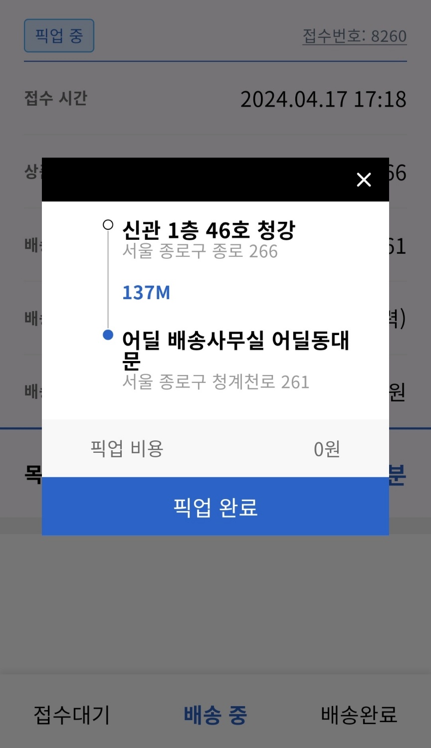 다음은 어플 조작 방법에 대해서 말씀드리려 하는데요! 픽업은 그냥 가서 물건만 가져오는 것이 아닌 어딜 어플을 통해 접수 후에 물건을 가지고 와야합니다. 배송하는 것과 동일한 개념으로 내가 가야하는 위치를 찾아 접수하고 픽업장소로 가서 픽업완료를 하고 다시 사무실로와서 배송완료하는 과정을 스마트폰에 입력시켜야 하기에 스마트폰 조작하는 방법을 알아야 합니다.