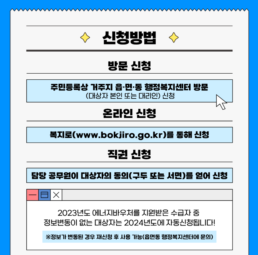 - 지원 대상자가 읍‧면‧동(읍·면·동 행정복지센터)에 신청 · 거동이 불편한 대상자는 친족 등이 대리 신청 가능하며, 읍·면·동 담당 공무원은 대상자 본인의 동의(구두 또는 서면) 하에 직권으로 신청 가능