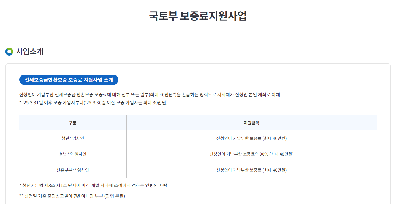 지원내용은 납부를 완료한 전세보증료에 대하여 전부 또는 일부를 지원해준다는 내용으로 최대40만원 한도내에서 지원을 해준다고 합니다. 단, 2025년 3월 31일 이후 보증 가입자만 40만원에 해당되며, 3월 31일 이전에 가입하신 분들은 최대 30만원 내에서 지원이 된다고 합니다.