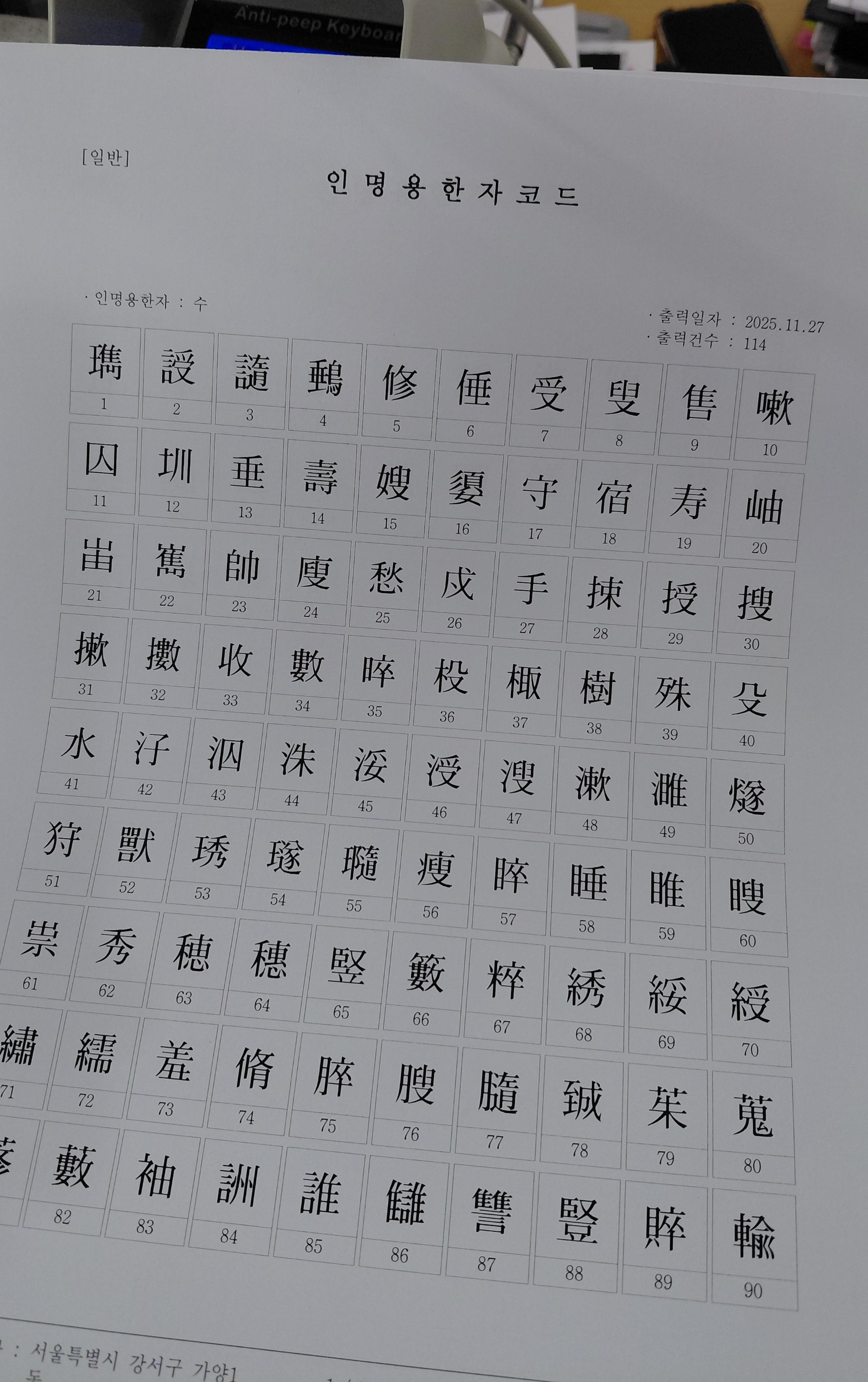 - 출생자 (한자) : 한자 이름을 정하셨다면 한자를 기입해서 가시는 것을 추천드려요! 저는 뜻만 알고 갔다가 한참을 찾았습니다. 왜냐하면 동사무소에서 인명용 한자코드라는 종이를 주는데 그안에 들어있는 한자로만 이름이 가능하다고 하니 한자 미리 알고 가시는 것을 추천드립니다.
