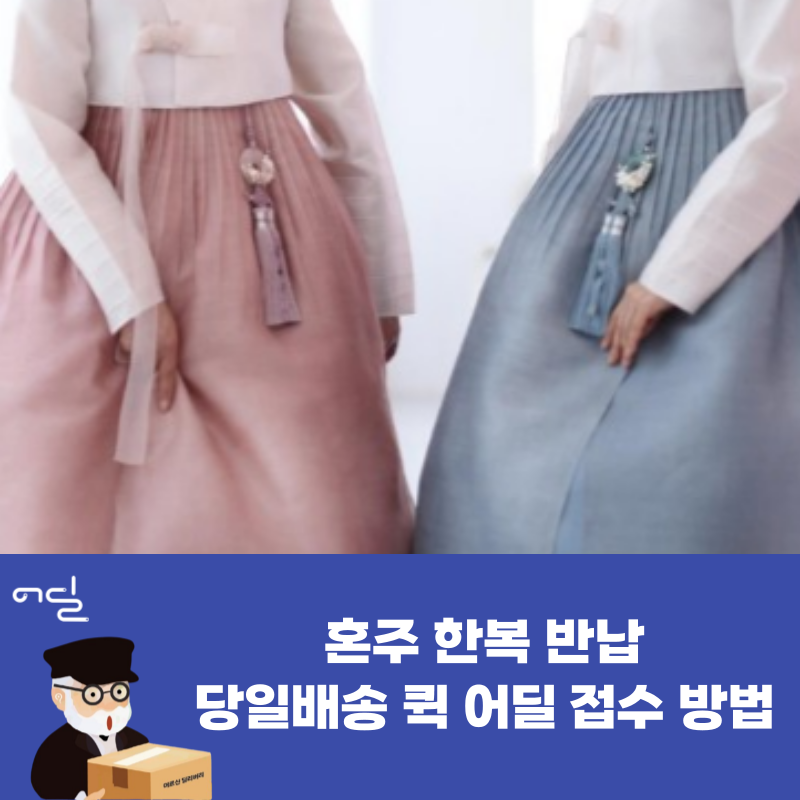 그런 고민을 덜어드리고자 혼주 한복 반납 당일퀵 배송업체 어딜을 소개하려고 합니다. 당일퀵 어딜 신청방법 및 순서를 잘 확인하셔서 이제 결혼식 끝나고 혼주 한복 반납 고민은 접고 편안한 마음으로 신혼여행 출발하시기 바랍니다!