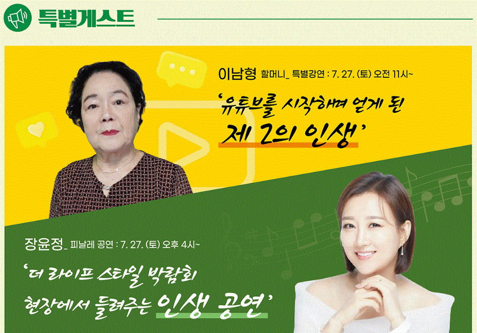 첫번째로 특별게스트가 있습니다. 유튜브를 시작하여 제 2의 인생을 살고 계시다는 유튜버 이남형님과 현장에서 들려주는 대한민국 대표 트로트 가수 장윤정님의 공연도 준비되어 있다고 합니다.