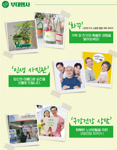 두번째는 부대행사로 나만의 작고 소중한 화분 커버를 꾸미는 화꾸, 당신의 아름다운 순간을 사진으로 남기는 인생사진관, 행복한 노년생활을 위한 구강건강 지키기 구강건강 상담이 준비되어 있다고 하니 아직 신청하지 않으신 분들은 서둘러서 신청하시기 바랍니다.