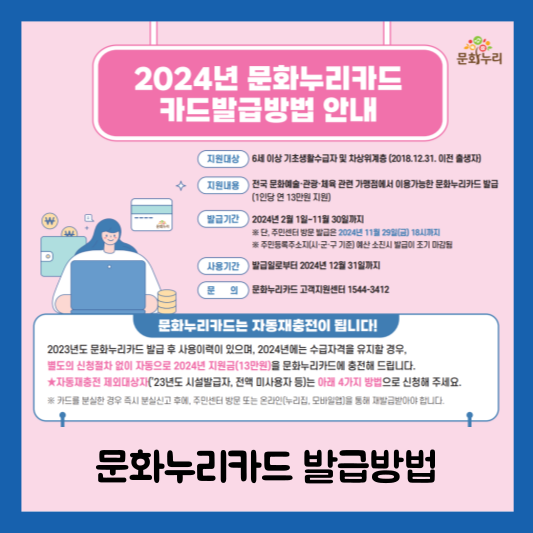 오늘은 문화누리카드 발급방법과 신청방법에 대해서 정리해보도록 하겠습니다. 추가로 지원대상과 지원내용 그리고 발급기간과 사용기간 등에 관련해서도 함께 알아보도록 하겠습니다.