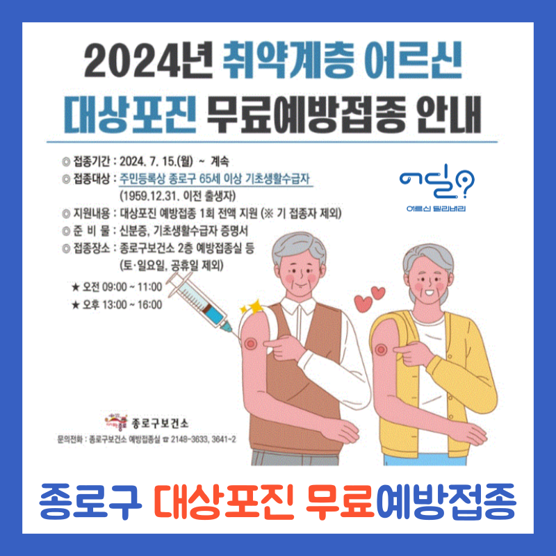 24년 서울시 종로구에서 65세 이상 취약계층(기초생활수급자) 어르신분들을 대상으로 대상포진 무료 예방접종을 지원한다고 합니다. 7월 15일부터 계속하여 접종 안내중이라고 하니 내용확인 하시고 신청하셔서 무료로 접종 받아보시기 바랍니다.